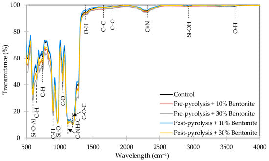 Characteristic absorption peaks observed across all samples included Si–O–Al (~650 cm−1) and C–H bending (600–800 cm−1), corresponding to aluminosilicate structures and aliphatic hydrocarbons, respectively [,]. These peaks became increasingly prominent with higher bentonite levels, particularly in pre-pyrolysis samples, indicating effective mineral incorporation and surface complexation. The Si–O stretching region (1000–1100 cm−1) showed enhanced intensity with increasing bentonite content, which was more pronounced in pre-pyrolysis samples, suggesting efficient integration of silicate structures. Additionally, stronger peaks for C–O (~1100 cm−1) and C–NH–C (~1125 cm−1) bonds suggest an enrichment of oxygenated and nitrogenous functional groups with bentonite addition [].
