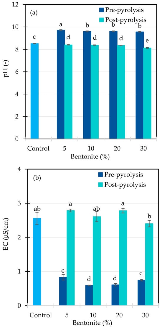 EC patterns also varied significantly among treatments (p < 0.001; Table 2). In pre-pyrolysis biochar, EC declined markedly, decreasing by approximately threefold across all bentonite concentrations compared to the control (Figure 4b). This trend is consistent with bentonite’s relatively low soluble salt content, and strong ion-binding capacity, which reduces the availability of free salts during pyrolysis []. In contrast, EC in post-pyrolysis biochar remained comparable to the control at bentonite levels of 5–20%, with a noticeable reduction only at 30%. The higher EC observed in post-pyrolysis treatments is likely due to the concentration of soluble salts during pyrolysis-driven OM decomposition and the partial activation of bentonite’s ion exchange surfaces [,]. However, the limited effect of post-pyrolysis bentonite on EC suggests minimal chemical interaction with the biochar matrix after thermal treatment [].