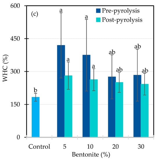 The pronounced WHC improvement at 5% and 10% bentonite during pre-pyrolysis suggests a synergistic effect, leveraging bentonite’s high surface area, cation exchange capacity, and swelling properties [,]. However, a decline of ~14% in WHC was observed when bentonite content increased to 20–30%, pointing to a potential saturation threshold. At excessive levels, bentonite may occlude biochar pores [], thereby reducing the available pore space for water retention. This is consistent with earlier findings that high bentonite loading can induce structural compaction, limiting water-accessible porosity despite strengthening the composite matrix [,].