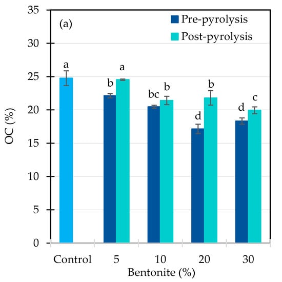 Interestingly, normalized OC exhibited distinct trends between treatments (Figure 5b). In pre-pyrolysis biochar, it declined slightly (by ~9%) at 5–20% bentonite and stabilized at 30%. Conversely, post-pyrolysis samples showed an increase in normalized OC—up to 13%—at higher bentonite levels (20% and 30%). This may indicate that bentonite, when applied after pyrolysis, contributes to relative carbon enrichment, possibly by adsorbing carbonaceous residues or stabilizing surface-bound carbon via mineral–organic interactions. Bentonite’s high surface area and CEC are key properties that facilitate such stabilization effects [,,].