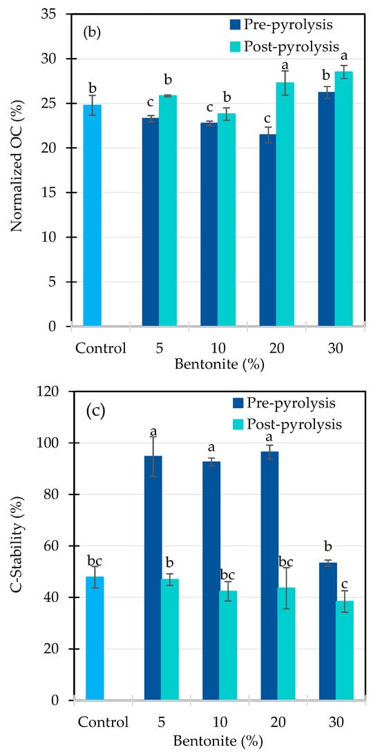 The pyrolysis method and bentonite application rate significantly affected the OC content, normalized OC, and carbon stability of biochar (p < 0.001), with significant interaction effects (Table 2). Increasing bentonite levels led to a progressive decrease in OC content in both pyrolysis methods (Figure 5a), likely due to the dilution effect of the added inorganic fraction. In the pre-pyrolysis treatments, OC content declined by approximately 26% from 0% to 30% bentonite, while post-pyrolysis treatments showed a 19% decrease.