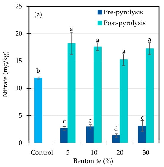 The concentrations of NO3− in the biochar were significantly influenced by pyrolysis process, bentonite addition rate, and their interaction (p < 0.001) (Table 2). Post-pyrolysis biochar exhibited a striking ~412% increase in NO3−, rising from 3.13 to 16.04 mg/kg (Figure 6a). However, the effect of bentonite varied substantially depending on the pyrolysis method. Pre-pyrolysis addition of bentonite markedly reduced NO3− levels by up to 89% at 20% bentonite, whereas post-pyrolysis incorporation resulted in a ~44% increase compared to the control.