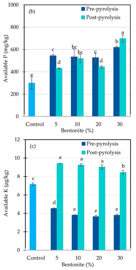 Available P was significantly influenced by the pyrolysis process (p < 0.001), bentonite addition rate (p < 0.05), and their interaction (p < 0.01) (Table 2), underscoring the combined effects of thermal treatment and mineral amendment on nutrient availability. In pre-pyrolysis treatments, P availability increased by approximately 81%—from 306.38 mg/kg in the control to an average of 555.84 mg/kg with bentonite addition (Figure 6b). Post-pyrolysis samples showed similar trends, with available P rising by ~55% at 5–20% bentonite and peaking at 697.84 mg/kg (+133%) with 30% bentonite.
