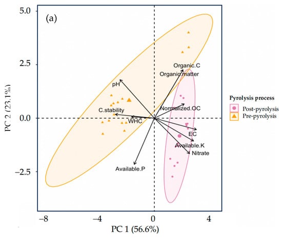 PCA revealed a clear separation between biochar samples amended with bentonite before pyrolysis (pre-pyrolysis) and those amended after pyrolysis (post-pyrolysis) (Figure 7a). Variables such as pH, WHC, and carbon stability were strongly aligned with pre-pyrolysis samples, whereas EC, NO3−, normalized OC, and available K clustered with post-pyrolysis samples. This distinct partitioning underscores how the timing of bentonite addition fundamentally shapes the physicochemical characteristics of biochar.
