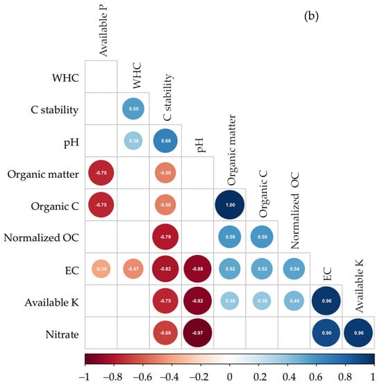 The correlation analysis (Figure 7b) supports these patterns. WHC positively correlated with pH and carbon stability, suggesting that alkaline, structurally stable biochars retain water better. Meanwhile, carbon stability showed negative correlations with OC, OM, and normalized OC, indicating that more stable biochar contains less labile or volatile organic fractions—consistent with Spokas [] and Singh et al. []. Additionally, pH and carbon stability were inversely related to EC, NO3−, and K, implying that more stable biochar may provide slow-release nutrient delivery due to tighter chemical binding or reduced solubility [].