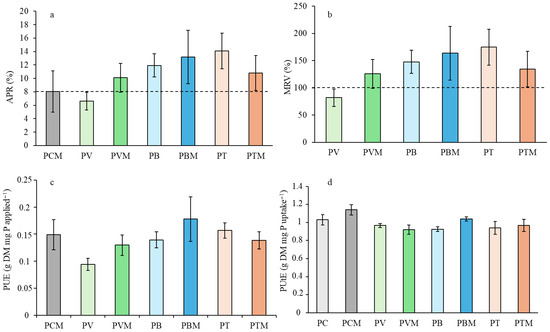 The highest mean PUE was recorded for the PBM treatment (0.18 g biomass mg−1 P applied), representing a 19% increase compared to PCM (0.15 g biomass mg−1 P applied). The mean PUE values for treatments PV, PVM, PB, and PTM were slightly lower than that of PCM. However, the mean PUE for the PT treatment (0.16 g biomass mg−1 P applied) was 5% higher than that of PCM (Figure 1c).
