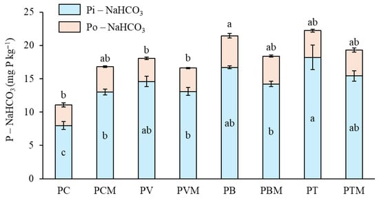 Regarding the organic P in the soil bicarbonate extract, significant differences were also observed among treatments (p < 0.005) (Figure 2). The black soldier fly frass treatment (PB) showed the highest organic P concentration, representing a 65.75% increase compared to the non-fertilized control (PC). Organic P in bicarbonate extract decreased in the order of PB, PBM, PT, and PTM, with no significant differences between them or with PCM (Figure 2). Treatments based on vermicompost (PV and PVM) exhibited lower concentrations of organic P in the bicarbonate extract than PB, without significant differences from the rest of the treatments.