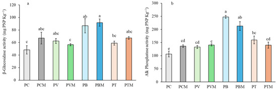 Effect of the different treatments on soil enzymatic activity. (a) B-glucosidase activity; (b) Alkaline phosphatase activity. Mean ± standard error. Means followed by different letters were significantly different, according to Tukey’s test at p < 0.05. PBM (black soldier fly frass + mineral P); PC (control without P); PCM (mineral phosphorus as K2HPO4); PT (mealworm frass); PTM (mealworm frass + mineral P); PV (vermicompost); PVM (vermicompost + mineral P).