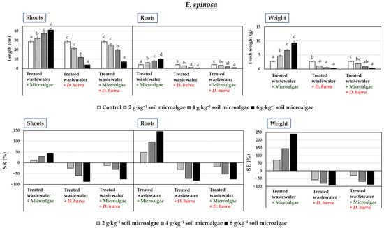 Results indicated that treatments with only microalgae was not an effective control strategy against E. spinosa, as its growth notably increased in a dose-dependent way, with each dose applied for all the parameters measured (Figure 2). In the case of H. vulgare, dose-dependent increases in all the parameters were also observed (Figure 3).
