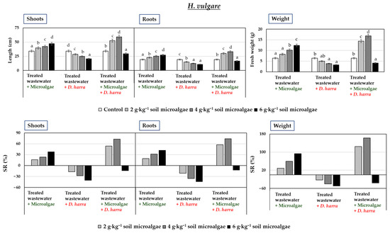 Fresh weight (g) and shoot and root length (cm) of Hordeum vulgare (two-month-old seedlings), along with percentage stimulation or reduction in growth (SR%), following irrigation with treated wastewater and soil application of microalgae and Diplotaxis harra leaf powders at a depth of 0.5 cm (applied individually or in a 1:1 combination at 2, 4, and 6 g·kg−1 soil) in pot experiments. Pots irrigated with tap water and without powder served as controls. Measurements were taken on 1 December 2023. Error bars represent standard errors (SE). Data are means ± SE (n = 10). Means sharing one or more letters are not significantly different (p < 0.05, Duncan test).