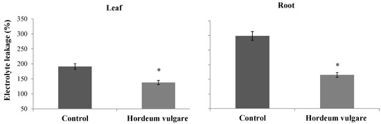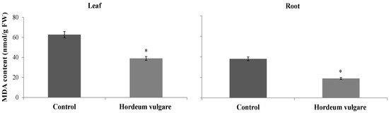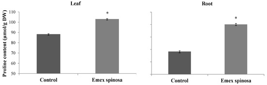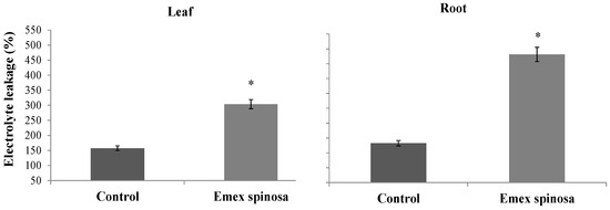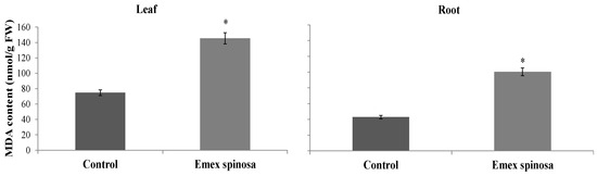 MDA content was improved by 94.67% and 134.70% for leaves and roots, respectively, after E. spinosa treatment. The treated samples showed values of 145.48 and 100.43 nmol MDA/g FW, in contrast to 74.73 and 42.79 nmol MDA/g FW for the control (Figure 5).