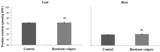 Treated E. spinosa seedlings had improved proline content in roots and leaves (Figure 4). For H. vulgare, the contents were like those in the control (Figure 7). Consequently, it appears that E. spinosa refuged to defense mechanisms through proline accumulation to alleviate the negative effect of phytotoxic substances produced by D. harra. In fact, the proline content increase in plants is part of their adaptive responses to environmental stresses, helping them to survive and thrive under adverse conditions [37]. Proline protects macromolecules and cellular structures from damage caused by induced oxidative stress. It acts as a reactive oxygen species scavenger. It helps to stabilize proteins and membranes, thereby mitigating the detrimental effects of stress on cellular integrity [37].
