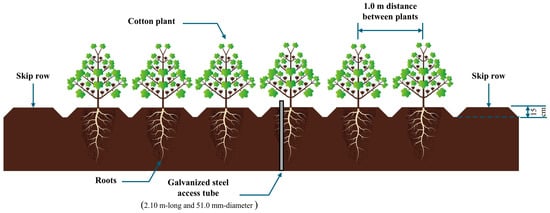 Over the two growing seasons, soil water and irrigation were monitored weekly using a calibrated neutron probe (503 ELITE Hydroprobe), a subsurface measurement device designed to measure soil moisture and aid in irrigation scheduling (https://www.instrotek.com/products/503-elite-hydroprobe, Last accessed on 25 March 2025). In May 2023 and 2024, a 2.10 m-long, 51 mm diameter galvanized steel access tube was installed in the middle of each plot, sufficient to disclose any deep percolation (Figure 3).