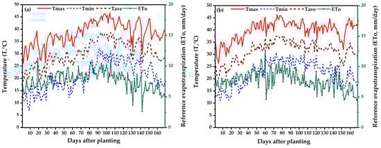 Daily maximum, minimum, average temperature, and reference evapotranspiration patterns (Tmax, Tmin, Tave, ETo) during the cotton growing seasons of 2023 (a) and 2024 (b).
