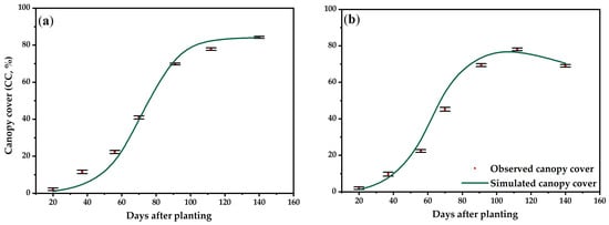 Observed and simulated cotton canopy cover (CC, %) for the 2023 cotton growing season. Flood 100%, 2023 (a) and 80%, 2023 (b). Average values are presented. The error bar indicates standard deviation (SD) among the three replicates.