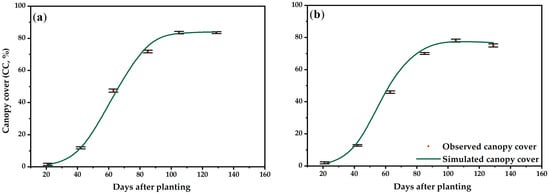 Cotton canopy cover curves, including the initial and maximum canopy cover (CCo and CCx), were estimated following the approach of Elshikha et al. [44]. Normalized water productivity (WP*) and H0 were calibrated until a good match between the observed and simulated Y was achieved.