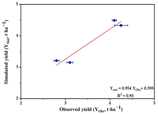 The correlation (R2) and regression equation between observed (Obs) and simulated (Sim) total cotton yields (Y, t·ha−1) for the 2023 and 2024 pooled data on average. R2 > 0.5 indicates a good correlation between Obs and Sim values. The error bars indicate standard deviation (SD) among the three replicates.