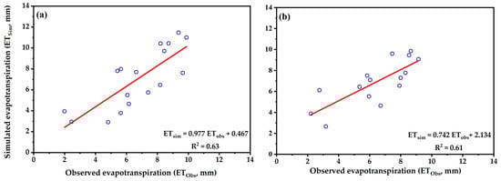 where Obsi is the observed value, Simi is the simulated value, and n is the number of values. Obs− and Sim− are the means of observed and simulated values, respectively. The R2 close to 1.0 indicates a good match between the simulated and observed datasets. The NRMSE value ranges between 0 and ∞. The simulation is excellent if the estimation results of NRMSE 10% and good if the result ranges between 10 and 20%. A result from 20 to 30% indicates fair performance, while NRMSE > 30% indicates poor performance [45]. The MAE reflects the difference between the mean absolute value of the Sim and the Obs value. The lower the MAE value, the greater the simulation accuracy. The Se between ±15 is acceptable [46]. The R2 values reflect the strength of the simulated datasets. The Dindex values vary between 0.0 and 1.0. The Dindex = 1.0 reflects perfect agreement among the simulated and observed datasets.