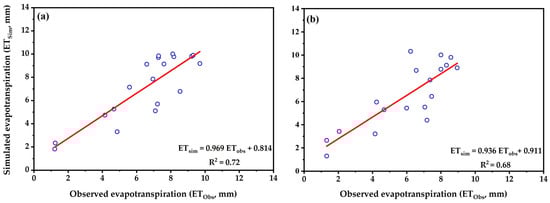 Observed and simulated cotton evapotranspiration (ET, mm) for the 2023 cotton growing season. Flood 100%, 2023 (a) and 80%, 2023 (b). R2 > 0.5 indicates a good correlation between observed (Obs) and simulated (Sim) cotton evapotranspiration.