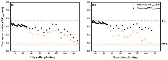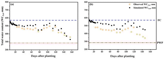 Observed and simulated total water content (WCTot, mm) in the soil profile of 1.70 m during the 2024 cotton growing season. Flood 100%, 2024 (a); and 80%, 2024 (b). FC and PWP refer to field capacity and permanent wilting point, respectively.