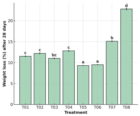 Final weight loss (%) in Musa paradisiaca after 28 days of storage at 13 °C and 95% RH. Bars represent the mean ± standard deviation. Different lowercase letters indicate statistically significant differences among treatments.