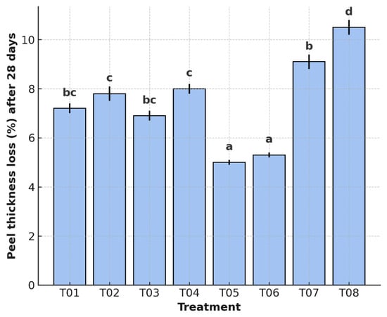 Final peel thickness loss (%) in Musa paradisiaca after 28 days at 13 °C and 95% RH. Bars represent the mean ± standard deviation. Different lowercase letters indicate statistically significant differences among treatments.