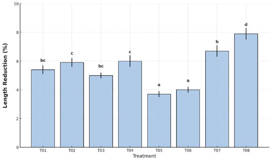 Final fruit length reduction (%) in Musa paradisiaca after 28 days of refrigerated storage. Bars represent the mean ± standard deviation. Different lowercase letters indicate statistically significant differences among treatments.