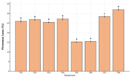 As shown in Figure 4, firmness loss varied significantly among treatments (p < 0.05). The uncoated and unpackaged control (T08) exhibited the greatest firmness reduction (32.2%), followed by the plastic-only control (T07) at 28.5%, both indicating accelerated softening and advanced ripening.