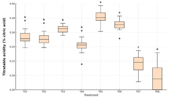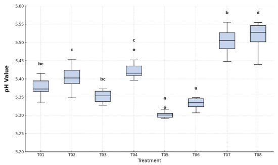 The results were used to evaluate ripening progression and chemical stability of the fruit during storage [38]. As shown in Figure 5, statistically significant differences were observed among treatments (p < 0.05). The highest pH values were recorded in T08 (uncoated, unpackaged control) and T07 (plastic-only control), with mean values of 5.55 and 5.52, respectively, indicating more advanced ripening. In contrast, T05 (5.30) and T06 (5.33) showed the lowest pH values, suggesting a delay in ripening and preservation of acid content.