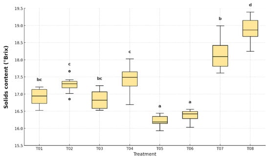 Treatments T01 (7.2%), T02 (7.8%), T03 (6.9%), and T04 (8.0%) showed intermediate values. According to Tukey’s HSD test, treatments were grouped into four distinct statistical categories, with T05 and T06 forming the group with the best performance.