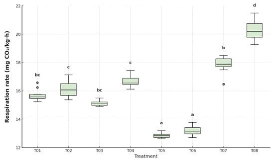 Was measured using a Horiba infrared gas analyzer (CG-100, Postharvest Research and Education Center, University of California, Davis, CA, USA), which quantifies carbon dioxide (CO2) production in a sealed environment. For this purpose, approximately 500 g of banana was placed in a hermetically sealed chamber to ensure an isolated system, preventing external air ingress and ensuring that any change in gas concentration was solely attributed to the metabolic activity of the fruit. CO2 production was expressed in µL CO2 kg−1 h−1, representing the amount of carbon dioxide released per kilogram of fruit per hour [54].