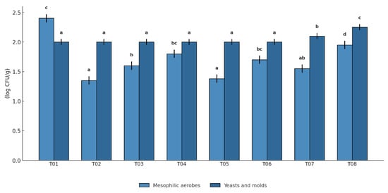 Microbiological evaluations were carried out at the end of the storage period, once the bananas had reached full ripening. The purpose of this analysis was to assess the effects of storage conditions and packaging type on the microbial quality of the fruit. Samples were taken from each treatment under aseptic conditions and processed in triplicate to ensure reproducibility and analytical reliability.