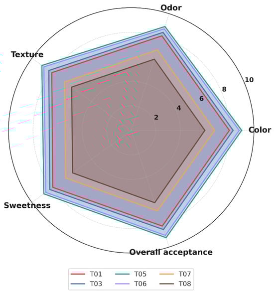 The sensory attributes evaluated included color, odor, sweetness, texture, and overall acceptance. A 10-point hedonic scale was used, where 1 indicated “dislike extremely” and 10 indicated “like extremely.” Evaluations were performed under controlled conditions to reduce variability and external influences. Each fruit sample was presented coded and randomized to prevent panelist bias. The test followed the guidelines established in ASTM E1871-10 for sensory analysis of food products [59].