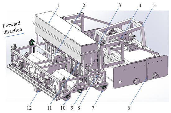 - He, X.; Zhang, R.; Zhang, J.F.; Zhu, Y.H.; Wang, W.Z.; Zhang, H.M. Design and test of a double compression seeder for pre-sowing and seed furrow of wheat in wide-seedling belts. Int. J. Agric. Biol. Eng. 2024, 17, 136–145. [Google Scholar]