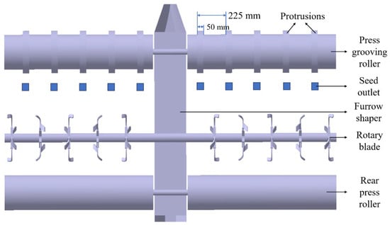 The structure of the double-press rotary tilling soil covering device within the seeder is illustrated in Figure 2. This device mainly consists of a press grooving roller with protrusions, a rotary tiller blade assembly, and a rear press roller. The press grooving roller and rotary tiller blade assembly are driven by the tractor’s power via a gearbox, whereas the rear press roller is ground-driven. During operation, the rotary tiller performs double-shaft cutting and rotary tillage on untilled land. After tillage, the furrow opener forms the initial shape of the drainage (a furrow to facilitate water drainage during rainfall), and the furrow shaper presses the soil downward to consolidate the furrow. As the implement advances, the press grooving roller goes over the tilled soil, compacting the surface soil. The specially designed protrusions on the press grooving roller not only compact the soil but also form seed furrows. Seeds are delivered into the seed furrows by seed metering devices driven by an electric motor and then covered by the rotary tiller blades. Finally, the rear press roller performs a second compaction, completing the sowing operation.