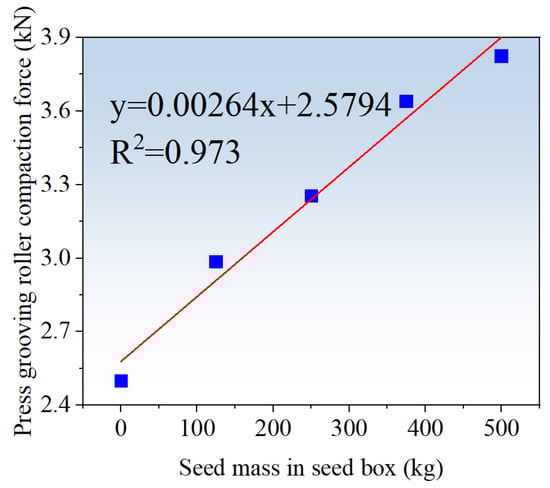 During operation, soil reaction forces concentrate primarily on the furrow shaper, with the press grooving roller bearing only a minor portion of the total support force. To measure press grooving roller compaction force, pressure sensors were installed between the roller bearing housing and frame. The force measured at this interface generally represents the soil compaction force exerted by the press grooving roller, although variations may occur depending on soil moisture content and soil type (such as clay, sandy, or silty soils). Experiments with varying seed masses in the seed box established the relationship between press grooving roller compaction force and seed mass, as illustrated in Figure 3.