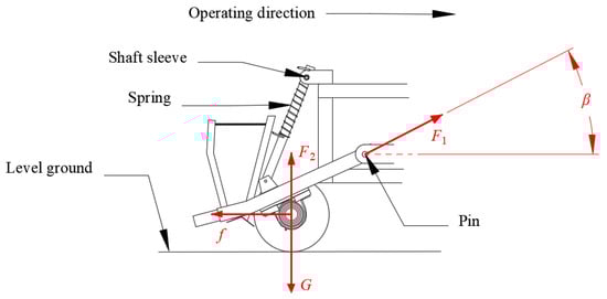 where F1 is the frame’s axial tensile force on the roller (N). F2 is the soil support force on the roller (N). f is rolling friction between the roller and the ground (N); as a driven wheel, f opposes the working direction. β is the angle between the roller bearing housing and the horizontal plane (°). G is the gravitational force on the roller (N).