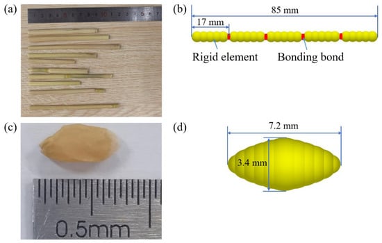 Discrete element models of straw and wheat. (a) Straw length. (b) Discrete element model of straw. (c) Wheat seed. (d) Discrete element model of wheat seed.