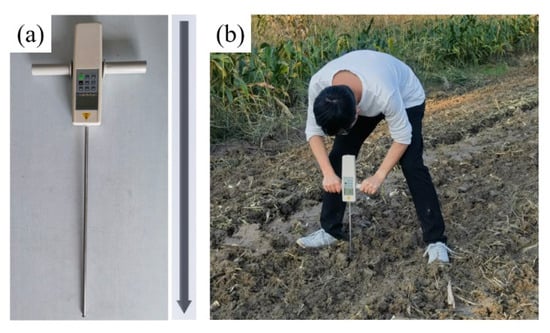 Soil penetration resistance measurement method. (a) TJS-100 soil cone penetrometer. (b) Soil penetration resistance measurement.