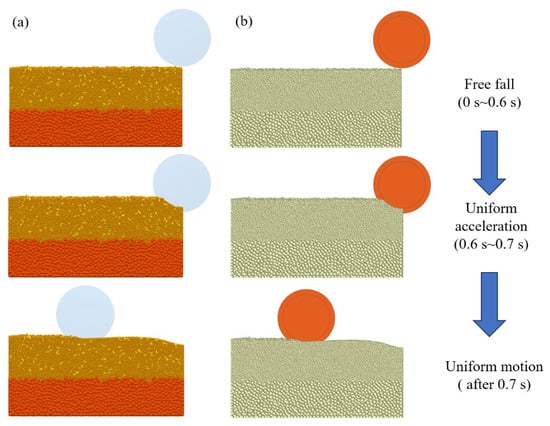 Three joints are specified for the press grooving roller within the software: a vertical sliding joint, a horizontal sliding joint, and a rotational joint around the roller axis of rotation. Prior to the simulation, the mass of the press grooving roller was set according to the required compaction force. The press grooving roller was controlled by a step function. It underwent free fall onto the soil bin model from 0 to 0.6 s. It was uniformly accelerated to the forward speed from 0.6 to 0.7 s. It moved forward at a constant speed to form the seed furrow after 0.7 s. Figure 8a,b illustrate the interfaces of EDEM and RecurDyn during the simulation, respectively. Taking a forward speed of 4.5 km·h−1 as an example, the press grooving roller remains stationary and falls freely under the influence of gravity from 0 to 0.6 s until it contacts the soil surface. Between 0.6 and 0.7 s, the forward speed of the roller increases from 0 to 1250 mm·s−1 (4.5 km·h−1). After 0.7 s, the roller moves forward at a constant speed of 4.5 km·h−1.