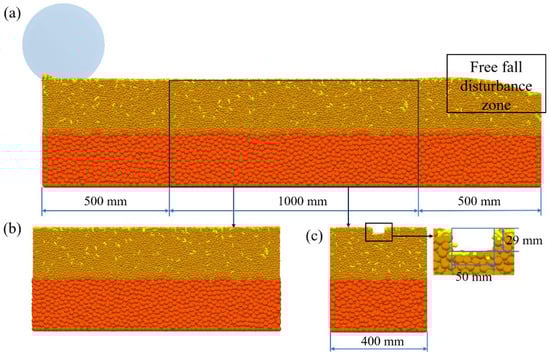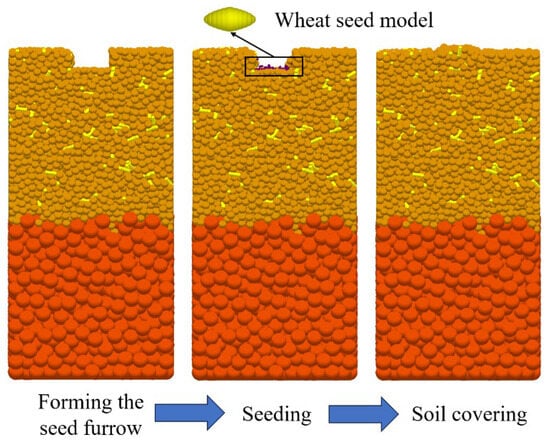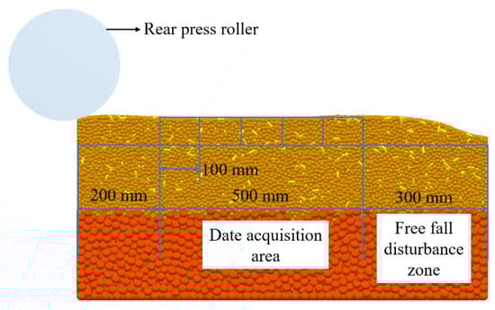 During seed groove pressing simulations, the free fall motion of the press grooving roller induces disturbances on the soil bin model. To establish a soil bin model of sufficient length for soil covering simulation, a 2000 mm × 400 mm × 450 mm soil bin model was constructed with the straw mulching amount set at 0.6 kg m−2 based on double-pressing simulation results. The model was then subjected to rotary tillage. The mass of seeds in the seed box was set to the intermediate value after rotary tillage. The press grooving roller with a protrusion height of 29 mm was used to form the seed furrow. The central undisturbed 1000 mm section of the soil bin model was selected as the model for the soil covering simulation, as illustrated in Figure 11. The rotary tiller blades scatter soil backward in all directions during rotary tillage. The height of the BOX in EDEM was set equal to that of the soil bin model to realistically simulate the soil covering effect. The particles falling outside the computational domain during scattering were excluded from the simulation. Particles exiting the computational domain during soil throwing were deactivated in subsequent simulations.