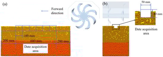 Four rotary tiller blades were uniformly mounted on the tillage shaft within a single rotational plane, arranged in a helical pattern. Adjacent blades on the same helix were positioned at a 45° phase angle. This configuration improved the uniformity during the soil covering process. Six data acquisition zones were established at the center area of the soil bin model using EDEM’s post-processing module. The size of each zone was set to 40 mm × 50 mm × 100 mm based on soil covering simulation results. The mass of soil and fragmented straw within these zones was measured. The data acquisition method is illustrated in Figure 12.