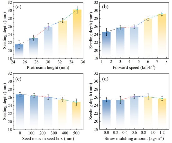 Results of single-factor simulation experiments on seeding depth. (a) Different protrusion heights on the press grooving roller. (b) Different forward speeds. (c) Different seed mass in the seed box. (d) Different straw mulching amounts. Error bars represent standard deviation (SD) of the mean.