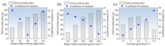 Results of single-factor experiments for soil covering operation. (a) Rotary tiller blade working depth. (b) Rotary tiller blade rotational speed. (c) Forward speed.