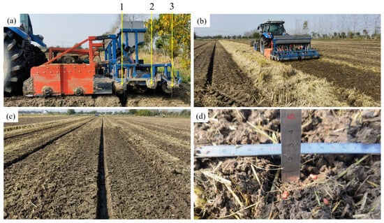 Field experiment scenarios. (a) Double-shaft rotary tillage and double-press seeder: 1. press grooving roller; 2. soil covering device; 3. rear press roller. (b) Field experiment. (c) Field operation performance of the seeder. (d) Methodology for sowing depth measurement.
