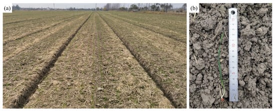 Wheat seeds of the Ningmai 13 variety were sown at a seeding rate of 135 kg·ha−1, with the application of 225 kg·ha−1 urea and 225 kg·ha−1 diammonium phosphate. The sowing operation was conducted at a speed of 4.5 km·h−1. Twenty days after sowing, the emergence of wheat seedlings was observed, as shown in Figure 16. The results showed that wheat seedlings emerged uniformly. Visual inspection of the sowing rows revealed no missing or broken seedlings. After uprooting, the root systems were observed to be intact, with the underground portion measuring approximately 25 mm, as shown in Figure 16b. Overall, the double-shaft rotary tillage and double-press seeder demonstrated good operational performance.