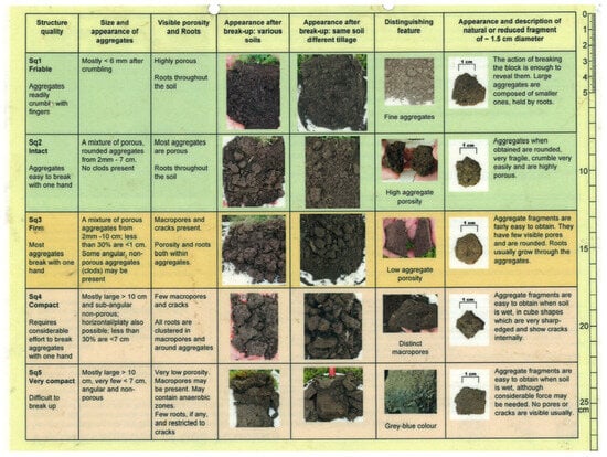 - Guimarães, R.M.L.; Ball, B.C.; Tormena, C.A. Improvements in the Visual Evaluation of Soil Structure. Soil Use Manag. 2011, 27, 395–403. [Google Scholar] [CrossRef]