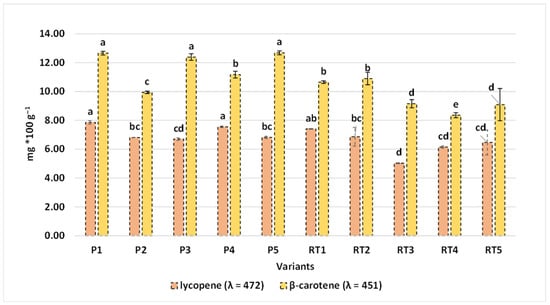 | Variant | Lycopene (mg ×100 g−1 Fresh Weight) | Carotene (mg ×100 g−1 Fresh Weight) |