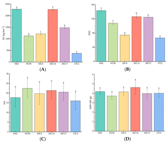 Yield and yield components of six rapeseed varieties under saline–alkali stress. (A) Theoretical yield (SY); (B) number of effective pods per plant (NES); (C) number of seeds per pod (AN); (D) 1000-grain weight (1000-SW). One-way analysis of variance (ANOVA) was used. Values are presented as mean ± standard error (n = 3). Different lowercase letters indicate significant differences between treatments (p < 0.05).