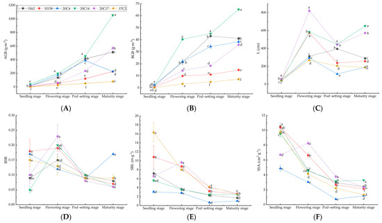 Agronomic traits of different rapeseed varieties at different growth stages under salt–alkali stress. (A) Above-ground biomass (AGB); (B) below-ground biomass (BGB); (C) total root length (L); (D) root-to-shoot ratio (RSR); (E) specific root length (SRL); (F) specific root surface area (SSA). Values are presented as mean ± standard error (n = 3). Different lowercase letters indicate significant differences between treatments (p < 0.05).